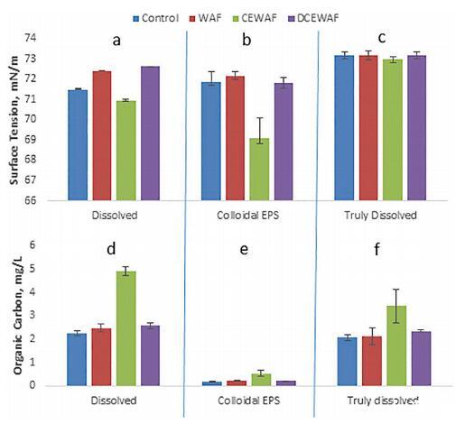 圖 2 中的有機(jī)碳表明大部分溶解的 部分,圖 2d,由低分子量碳組成,因?yàn)榭側(cè)芙獠糠郑瑘D 2f,幾乎等于 有機(jī)碳濃度中的溶解分?jǐn)?shù)。 膠體 餾分(圖 2e)表明超濾已去除了 85% 到 95% 的 溶解部分的有機(jī)碳。 這可能表明 5% 到 15% 的 CEWAF 可能保留在 EPS 膠體部分中, 表明 SFT 的降低(圖 2b)也受 Corexit 的影響 和 WAF。 然而,使用 SFT 與 Corexit 濃度數(shù)據(jù), 圖 4b,即使是 15% 的 Corexit 也無法解釋 在圖 1 的 CEWAF 處理中測量的 SFT 降低。