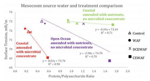 EPS 膠體溶液的 SFT 與 蛋白質(zhì)(更疏水)到多糖(更親水) 集中度,可以作為整體的相對度量 膠體部分的疏水性。 此外,圖1中的數(shù)據(jù) 意味著石油和/或 Corexit 的存在導(dǎo)致增強(qiáng) EPS 膠體的蛋白質(zhì):多糖比率,但降低了 膠體部分的 SFT。 CEWAF 中蛋白質(zhì)含量較高 處理對應(yīng)的細(xì)菌計(jì)數(shù)高于其他處理 治療(Kamalanathan 等人,2018 年;Doyle 等人,2018 年)。 DCEWAF 還具有更高的蛋白質(zhì)含量和更高的蛋白質(zhì):多糖 比 WAF 和對照處理。 值得注意的是,當(dāng) 與不同的中宇宙實(shí)驗(yàn)相比,開闊的海洋中宇宙的油濃度高兩倍,相對 DCEWAF 處理中的 Corexit 含量較高,即它們僅 ~6.3 倍稀釋的 CEWAF,而 DCEWAF 處理來自 用微生物濃縮物修正的沿海水域約 15 倍 稀釋的 CEWAF 和經(jīng)過修正的營養(yǎng)物質(zhì)的沿海水域是 ~ 10 倍稀釋的 DCEWAF(表 1)。 因此,趨勢線的斜率 可能受到 DCEWAF 中 Corexit 數(shù)量的影響,并且 CEWAF 處理 SFT 和蛋白質(zhì):多糖 比率。 由于其表面活性劑特性,Corexit 降低了 SFT,但它 還增強(qiáng)了蛋白質(zhì)的產(chǎn)生,導(dǎo)致比對照和 WAF 處理更高的蛋白質(zhì):多糖比率。 這 相對 SFT 和蛋白質(zhì):對照和 WAF 的多糖位置 可能是由膠體和海水的組成和濃度的微小差異產(chǎn)生的。