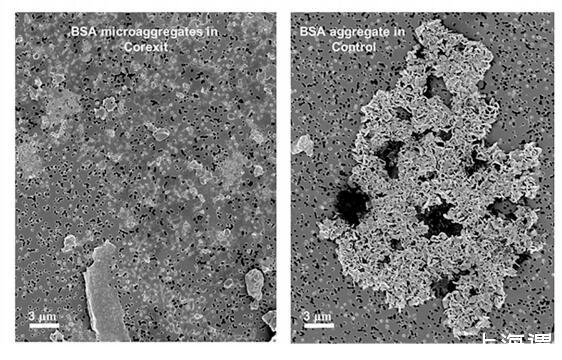 相同放大倍數(shù)下 BSA 聚集體的 SEM 圖像(圖 3b) 在 Corexit(左)和 ASW 中用 0.1% BSA 溶液制備 來自與圖 3a 中相同的溶液的對照處理(右)。 這 Corexit 處理(左圖 3b)顯示來自液體的微聚集體 階段。 對照處理(圖 3b 右)顯示了一個(gè)大結(jié)晶 蛋白質(zhì)聚集體。 圖 3a 和 3b 中描繪的結(jié)果支持 靜電相互作用和共價(jià)鍵作用的重要性 在微聚集體形成中(Corexit 與 Ca2+ 離子突出顯示 CTC) 和 Ca2+ 螯合中的配位共價(jià)鍵 CTC 和陰離子親水部分(CEWAF、WAF 和對照 處理)形成比 Corexit 更少但更大的聚集體 治療。