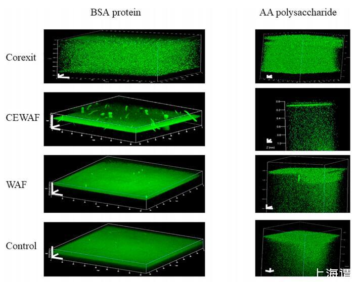 四種治療的共聚焦激光掃描顯微鏡 (CLSM) 帶有模型 EPS 組件的處理如圖 3 所示。 ASW 顯示在左側(cè) BSA 的 0.1% 垂直系列溶液中 右邊是一系列 0.1% 的海藻酸溶液。 橫向, 面板顯示了 Corexit、CEWAF、WAF 的相應(yīng)處理, 和對照,用于 BSA 和海藻酸溶液。 綠色熒光探針 CTC 突出顯示與陰離子結(jié)合的親水性 Ca2+ 多糖和蛋白質(zhì)的區(qū)域。 對于海藻酸和 BSA實(shí)驗(yàn),單獨(dú)使用Corexit就可以分散模型分子 無界面積聚。 圖像也顯示出明亮密集 微聚集體中較高傾向的綠色熒光 Corexit 比在其他治療中看到的要多。 海藻酸面板全部顯示 聚集體的分散,而 BSA 面板顯示主要在界面處的蛋白質(zhì)。 CEWAF 海藻酸和 BSA 可以生成 清晰的界面層。 CEWAF 中的 BSA 顯示聚合 當(dāng)它們向上擴(kuò)散時(shí)在垂直方向上被夸大 隨著圖像曝光的時(shí)間。 此外,BSA CEWAF 顯示聚集體似乎在液體表面上方,因?yàn)樗鼈兪?在未顯示的泡沫層之內(nèi)和之上。 具有主要親水部分的控制處理表現(xiàn)出較少的分散 和不太明顯的界面層。 雖然垂直尺度較小 對于 BSA 圖像比對于海藻酸圖像,仍然很明顯 海藻酸分散在整個(gè)體積中,而 BSA 迅速擴(kuò)散到界面。 唯一的例外是 Corexit 處理顯示沒有界面積聚和完全分散 海藻酸和BSA。