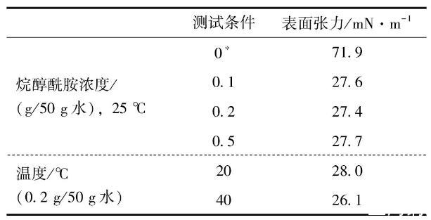 表1自制烷醇酰胺不同測(cè)試條件下表面張力