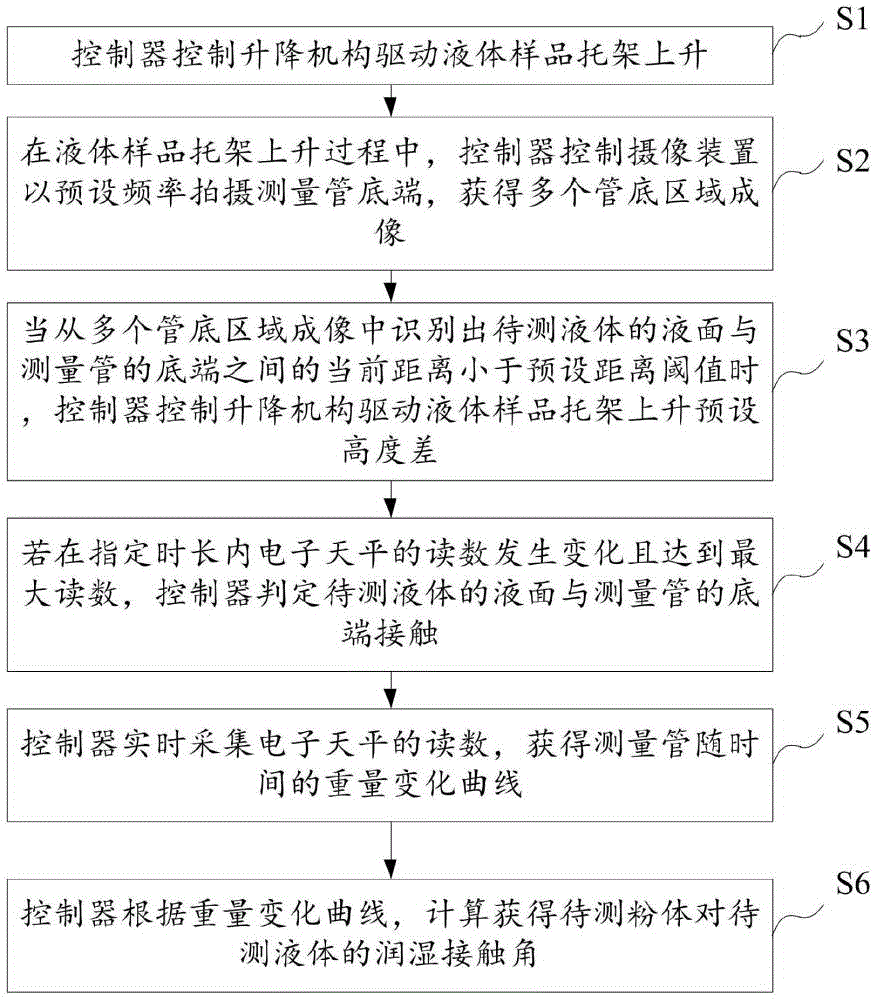 粉體材料潤濕接觸角測量方法應(yīng)用于表面張力儀,所述表面張力儀包括殼體以及設(shè)置于殼體內(nèi)的電子天平、底端用微孔板封閉的測量管、液體樣品托架、升降機構(gòu)和攝像裝置;所述電子天平的底部設(shè)置有連接桿,所述連接桿與所述電子天平的稱重盤固定連接,所述測量管垂直懸掛于所述連接桿下方,所述測量管的底端位于所述攝像裝置的攝影取景范圍中,所述測量管內(nèi)裝有待測粉體,所述液體樣品托架用于固定裝盛有待測液體的樣品容器,所述液體樣品托架由所述升降機構(gòu)驅(qū)動升降;所述測量方法包括: