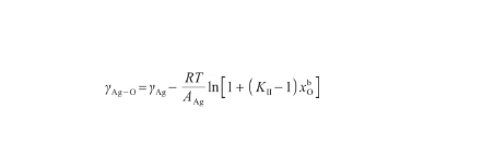 由式(12)和(13)可以看出,Butler方程計算較為復雜??紤]液態氧的表面張力很小[14],可以認為γO≈0。另外,由于Ag-O系中O原子數遠小于Ag原子數[29],可以將Ag-O溶體視為理想溶體。此時,GE,b=G=G=0。根據文獻[18],當式(12)所示的Butler方程用于描述理想溶液時,通過假設系統內兩組分具有相等的摩爾表面積,可以得到改進的Butler方程。這個改進的Bulter方程能夠推導出Gibbs吸附方程和Langmuir方程,被認為是表面張力和溶液吸附的根本方程。因此,令AAg=AO,將式(12)變換為: