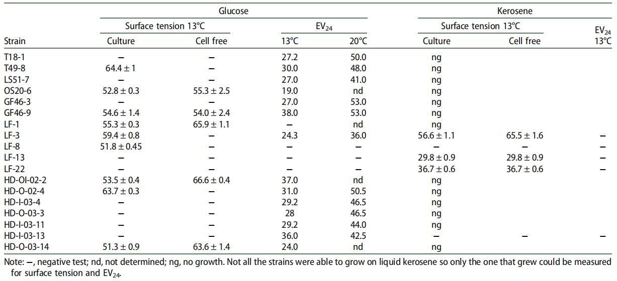 表 1. 在葡萄糖和煤油上生長的細菌菌株的培養物和培養物濾液的表面張力和乳化值。