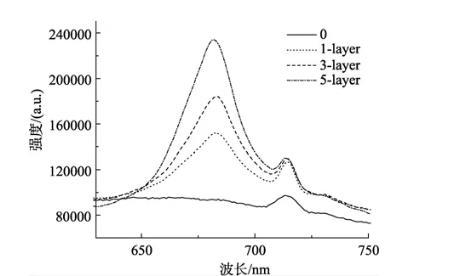 圖4是石莼類囊體膜LB膜在納米ZnO上的室溫?zé)晒獍l(fā)射光譜,類囊體膜的最大熒光發(fā)射峰在683 nm,隨著類囊體膜在ZnO上吸附層數(shù)的增加熒光發(fā)射強(qiáng)度增大。菠菜類囊體膜的熒光發(fā)射光譜表現(xiàn)出相同的趨勢(結(jié)果未顯示)。