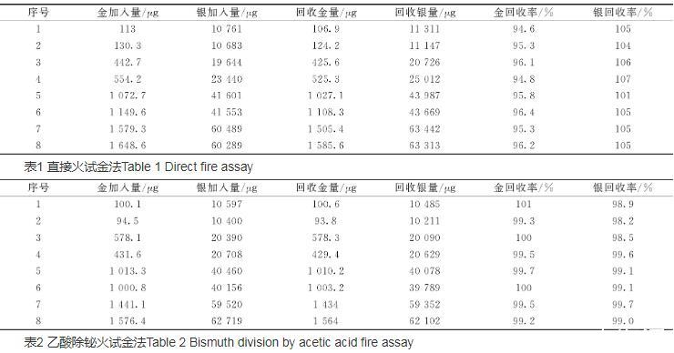 表2結果為用乙酸除鉍火試金法,再進行如表1的實驗,從表2可以看出金加標回收率99.2%~101%,銀加標回收率98.2%~99.7%,說明已消除鉍的干擾,結果準確可靠。