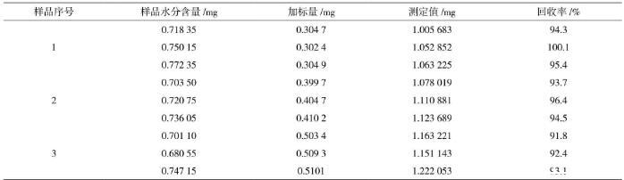 在樣品中加入精密稱取的標準水加標水平分別為0.3 mg、0.4 mg、0.5 mg,在150℃加熱10 min的測定條件下,采用滴定度為1 mg/mL的費休氏試劑,每個加標水平重復測定3次,經測定,加標回收率在91.8%~100.1%,結果見表6。