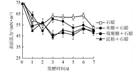 補(bǔ)加碳源與單一石蠟作為培養(yǎng)基碳源相比更有利于促進(jìn)菌株代謝環(huán)境的表面張力降低以及乳化活性升高,其中木糖-石蠟碳源有利于促進(jìn)細(xì)胞生長OD600nm值為0.77,減少了11%的石蠟消耗,并且表面張力降至最低49.5 mN/m,乳化活性高達(dá)61.3%。葡萄糖-石蠟以及淀粉-石蠟碳源不能明顯促進(jìn)細(xì)胞生長,但在發(fā)酵前期能減慢對石蠟的利用,明顯促進(jìn)生物表面活性劑的合成。