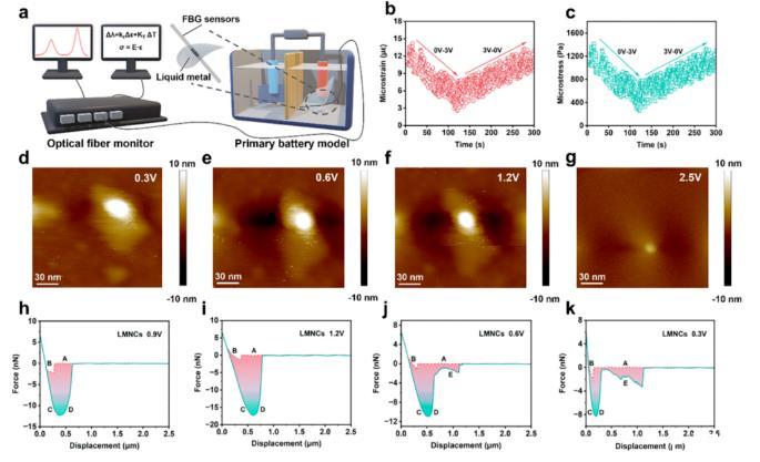 圖2電極材料的應(yīng)力-電化學測試。(a)光纖布拉格光柵傳感器(FBG)在液態(tài)金屬中的應(yīng)力-電化學測試示意圖。(b,c)FBG在液態(tài)金屬中的應(yīng)力響應(yīng)圖。(d-g)不同電壓下軟包電池中LMNCs的AFM測試圖。(h-k)不同電壓下的LMNCs力-位移曲線圖。