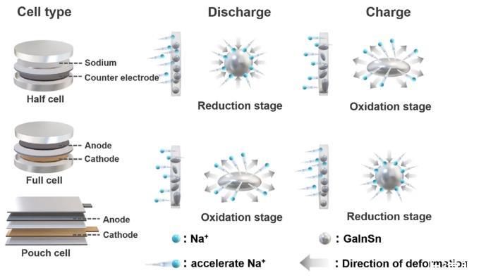 該工作闡述了液態(tài)金屬界面張力與電極電勢之間的關(guān)系,并闡明了電極電勢對Na+電化學傳輸速率的影響(圖1)。在還原反應(yīng)過程中,電極電勢降低,液態(tài)金屬的界面張力加快了Na+向內(nèi)的傳輸速率。在氧化反應(yīng)過程中,電極電勢增加,液態(tài)金屬表面電荷密度增大,界面張力下降,加快了Na+向外的傳輸速率。在此基礎(chǔ)上,為了加強液態(tài)金屬結(jié)構(gòu)穩(wěn)定性,構(gòu)筑液態(tài)金屬核殼包覆結(jié)構(gòu)(LMNCs),其自調(diào)節(jié)的界面張力有效改善了Na+傳輸動力學過程。