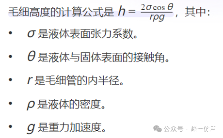 解答上述問題,可以從毛細(xì)高度的計(jì)算公式中找到答案。