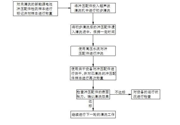 此沖壓配件的表面張力改善方法,就是通過將同一生產(chǎn)批次的沖壓配件放入超聲波清洗機(jī)中,超聲波清洗機(jī)產(chǎn)生的超聲波的高頻振動(dòng)能夠產(chǎn)生微小的氣泡,這些氣泡在液體中爆裂時(shí)會(huì)產(chǎn)生沖擊力,對(duì)沖壓配件進(jìn)行初步清洗。然后,將經(jīng)過初步清洗的沖壓配件放入事先配置好的碳?xì)淝逑匆褐?,進(jìn)一步去除沖壓配件表面的氧化物和殘留物。再將經(jīng)過清洗液清潔處理過的沖壓配件取出,并使用高壓水流對(duì)清潔后的沖壓配件進(jìn)行沖洗,去除表面上的頑固污漬和顆粒,確保沖壓配件上的清洗液和殘留物被徹底清除。通過多重的清洗流程,有效提升新能源電池沖壓配件表面的清潔度,能夠達(dá)到理想的清洗效果,有效改善新能源電池沖壓配件的表面張力。