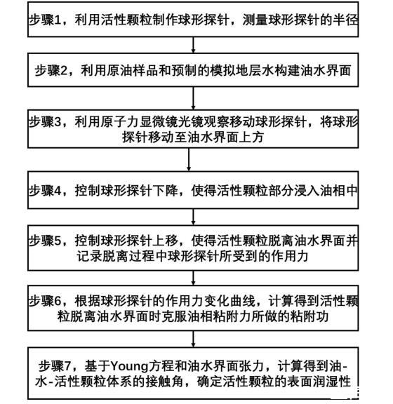 步驟7,利用界面張力儀測量油相與水相之間的界面張力,基于Young方程,結合球形探針的半徑以及球形探針的下降高度,計算得到油-水-活性顆粒體系的接觸角,確定活性顆粒的表面潤濕性。