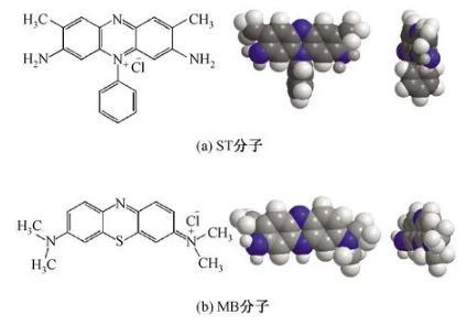 為了更清晰地了解界面組裝中使用的亞相溶液特征,把所選的ST和MB染料分子進行了二維和三維空間填充模型正面、側面的表示,如圖2所示,可以更直觀地觀察到兩種分子結構上的差異。它們的相似之處在于,都含有較大的雜環(huán)共軛體系,可以在LDH-HS復合LB膜中形成H-和/或J-型的聚集體[20]。這也就對應于前面提到的LDH-HS/染料復合膜在透射電鏡和原子力顯微鏡下觀測到的不同形態(tài)的聚集體。也正是由于LDH-HS分子片層為染料分子提供了合適的生長平臺,在LB技術的幫助下在氣-液界面之間形成了高質量的、均勻致密的LDH-HS/染料分子聚集體。