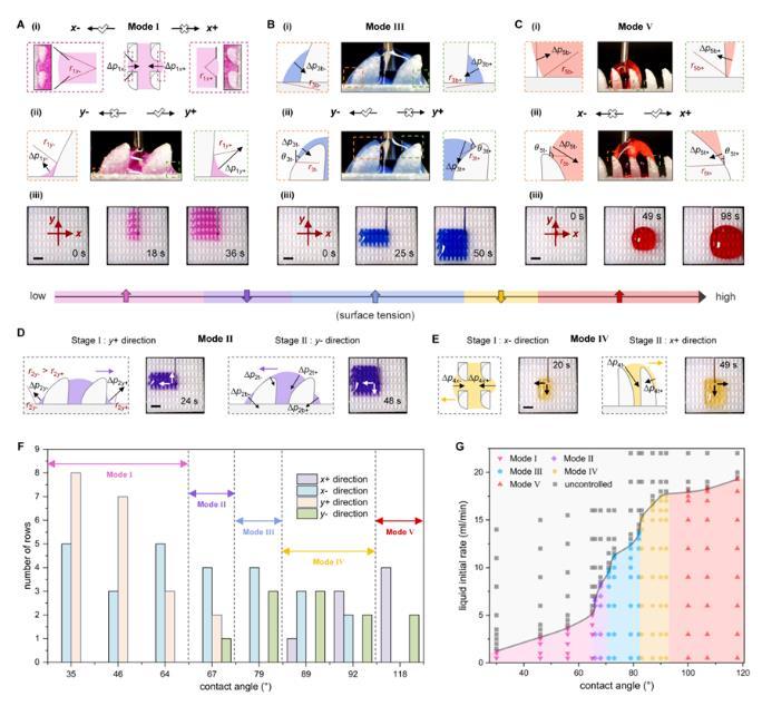 注入結(jié)構(gòu)化表面的液體首先填充相鄰四個單元間的空隙,并在單元的特定曲率結(jié)構(gòu)處形成局部曲率不等的液體彎月面,這導(dǎo)致液體表面不同位置的拉普拉斯壓差不同,進而驅(qū)動液體定向運輸。隨表面張力從低到高(22-72 mN/m),液體呈現(xiàn)出五種不同的運輸模式(I至Ⅴ)。研究人員利用水-乙醇溶液對這五種模式下液體沿x軸和y軸方向上的運輸行為進行力學(xué)分析(圖2)。表面張力較低的液體對界面的潤濕性較高,因此主要在單元底部曲率結(jié)構(gòu)作用下,沿拉普拉斯壓差較低的方向運輸;而表面張力較高的液體會在結(jié)構(gòu)化表面上積累,其運輸方向由單元頂部曲率調(diào)控。