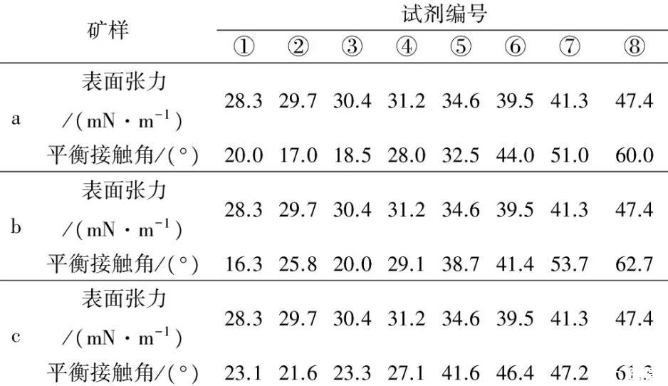 其中3種礦樣的表面張力和接觸角對(duì)應(yīng)值如表1所示。
