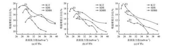 試驗(yàn)選擇3種陰離子表面活性劑(均為化學(xué)純)。分別是:十二烷基苯磺酸鈉(簡(jiǎn)稱SDBS)、十二烷基磺酸鈉(SDS)、十二烷基硫酸鈉(K12)。使用QBZY系列全自動(dòng)表面張力儀測(cè)出不同溶液的表面張力,將3種濕潤(rùn)劑均配制成表面張力范圍在25~40 mN/m的7種水溶液。