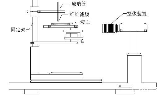 研究礦塵濕潤(rùn)性能的裝置有很多,根據(jù)實(shí)際出發(fā),試驗(yàn)采用毛細(xì)管反向滲透法實(shí)驗(yàn)裝置。(1)本實(shí)驗(yàn)選用的玻璃管長(zhǎng)度為200 mm,內(nèi)徑為4 mm,給每個(gè)玻璃管劃好刻度,其下端用纖維濾膜密封;(2)用分度值為0.1 mg的光學(xué)讀數(shù)分析天平稱取1.5 g的礦塵裝入干燥過后的玻璃管中,為提高精度,每次初填至60 mm,然后振實(shí);(3)將玻璃管固定在固定臺(tái)上,盛有濕潤(rùn)劑溶液(約20 mL)的玻璃皿置于載物臺(tái)上,旋轉(zhuǎn)載物臺(tái),使玻璃管底部與溶液表面接觸;(4)當(dāng)液面透過濾膜后,打開錄像設(shè)備記錄反向滲透到20,30,40 mm所需時(shí)間,同時(shí)記錄3 min后玻璃管的增重作為吸濕量。每種溶液對(duì)礦塵做3次試驗(yàn),取平均值。實(shí)驗(yàn)裝置如圖1所示。