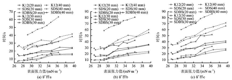 通過測(cè)定液面滲透到20,30,40 mm的時(shí)間,繪制3種礦塵反滲時(shí)間與表面張力的關(guān)系,如圖3所示。