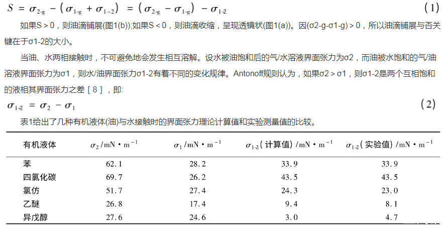 圖1中液體表面存在界面張力[5-6],其值的大小是物質(zhì)分子間相互作用的一種反映,與物質(zhì)的本性有關(guān)。在常見(jiàn)純液體中,水的界面張力最高,25℃時(shí)為72.0mN·m-1,極性有機(jī)物液體的界面張力大多低于50mN·m-1,非極性有機(jī)液體的界面張力一般更小[7]。由此可知,氣/水界面張力大于氣/油界面張力,即σ2-g>σ1-g。根據(jù)鋪展系數(shù)(S)的定義: