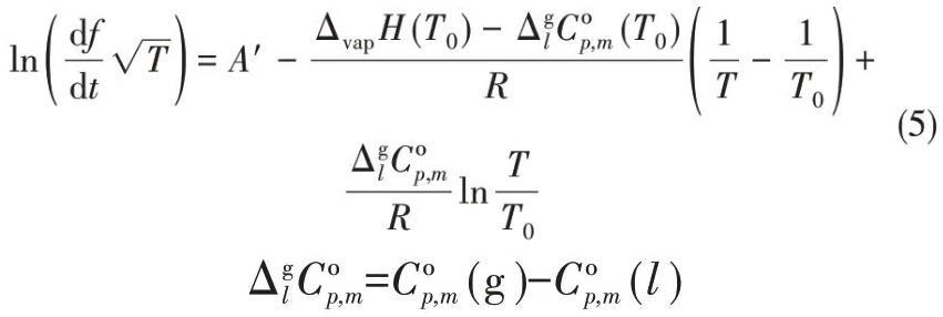 Verevkin等[54]開發(fā)了評估程序的物理基礎,并使用1-乙基-3-甲基咪唑雙(三氟甲磺酰基)酰亞胺[C2mim][Tf2N]進行測量,從而將蒸發(fā)焓的測量范圍降低到363 K。和文獻中已有的數(shù)據(jù)相比較,具有一致性。這項工作中開發(fā)的方法也為得到ILs的汽化焓開辟了一條新途徑。經(jīng)過一系列公式推導,構建了ILs的摩爾汽化焓、頻率損耗率df/dt和溫度的關系