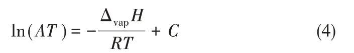將ln(AT)對1/T作圖,回歸線性方程,從斜率可以得出ILs的汽化焓數(shù)據(jù)。