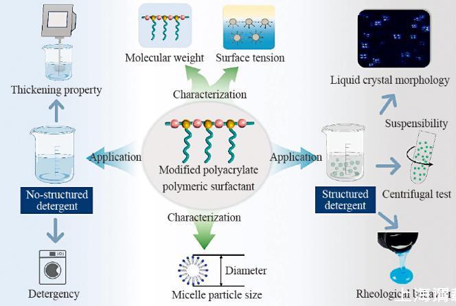 高分子表面活性劑,是指分子結(jié)構(gòu)中含有親水和疏水基團(tuán),且相對(duì)分子量在數(shù)千以上的化合物。與低分子量的表面活性劑相比,大部分高分子表面活性劑的表面活性較弱,滲透性和起泡性差,但分散、乳化以及絮凝等性能較好。因此,在織物洗滌劑中,高分子表面活性劑常常被用作聚合物。然而,不可否認(rèn),高分子表面活性劑在洗滌劑中時(shí),除了對(duì)黏度、去污力等表觀(guān)性能有影響外,其復(fù)雜的結(jié)構(gòu)和高分子量也會(huì)影響表面活性劑復(fù)配體系的微觀(guān)表現(xiàn):如膠束聚集行為、液晶形態(tài)等等。作為一種新型的特殊表面活性劑,探究高分子表面活性劑在洗滌體系中的應(yīng)用將有利于織物洗滌技術(shù)的革新。