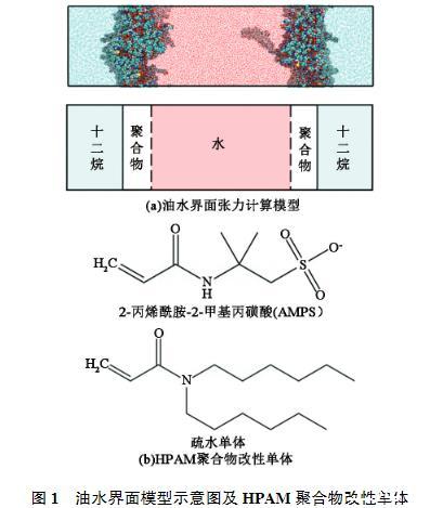 早期的聚合物驅(qū)主要采用部分水解聚丙烯酰胺(HPAM),具有界面活性低、耐溫/耐鹽性差等缺點(diǎn)。通過(guò)對(duì)HPAM進(jìn)行改性,不僅能改善驅(qū)替液的流變性能,還能提高HPAM的界面活性,促進(jìn)HPAM在油水界面的吸附,以降低油水界面張力,起到乳化原油的作用。目前主要通過(guò)試驗(yàn)手段考察原油乳化行為,使用傅里葉紅外光譜、核磁共振等儀器可表征聚合物或表面活性劑的構(gòu)象;利用電鏡可觀察乳狀液的形貌和尺寸;通過(guò)界面張力測(cè)量可評(píng)價(jià)聚合物、表面活性劑等的界面活性。分子動(dòng)力學(xué)(MD)模擬是基于統(tǒng)計(jì)物理原理,將原子、分子的運(yùn)動(dòng)與體系宏觀性質(zhì)建立關(guān)系的一種計(jì)算模擬方法。Du等對(duì)3種聚合物驅(qū)油劑進(jìn)行MD模擬,比較不同溶液的黏度,揭示鹽離子誘導(dǎo)聚合物聚集的機(jī)制。Abdel-Azeim等利用MD模擬研究HPAM聚合物和磺化HPAM的締合行為,發(fā)現(xiàn)磺化基團(tuán)與陽(yáng)離子的相互作用較弱,鹽離子的存在會(huì)促進(jìn)聚合物的締合。Kshitij等使用MD模擬計(jì)算熔融聚甲基丙烯酸甲酯的表面張力,其隨溫度變化的結(jié)果與試驗(yàn)測(cè)試結(jié)果相符。界面處的張力主要來(lái)源于界面處原子受到垂直于界面的應(yīng)力不均衡,從而引起界面處產(chǎn)生平行于界面的張力。筆者對(duì)親水性的HPAM進(jìn)行改性,通過(guò)接枝疏水基團(tuán)增強(qiáng)聚合物與油相的相互作用,減弱油水界面處分子受力的不均衡,通過(guò)降低油水界面張力從而獲得高的界面活性。進(jìn)一步通過(guò)接枝具有耐鹽性的磺酸基團(tuán),以提升聚合物在高礦化度儲(chǔ)層中的性能。