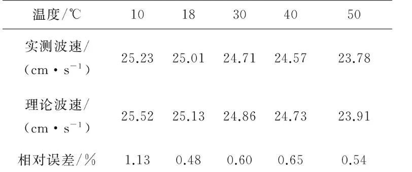 將之前得到的多組表面張力系數(shù)和波長(zhǎng)數(shù)據(jù)代入式(1)中計(jì)算理論波速,再與實(shí)驗(yàn)中的實(shí)測(cè)波速作比較,便可以通過(guò)實(shí)驗(yàn)驗(yàn)證水波波速與其表面張力關(guān)系公式的的正確性。在不同溫度下,實(shí)際測(cè)得的波速、由原理公式計(jì)算出的理論波速以及兩者的相對(duì)誤差數(shù)據(jù)列于表5。