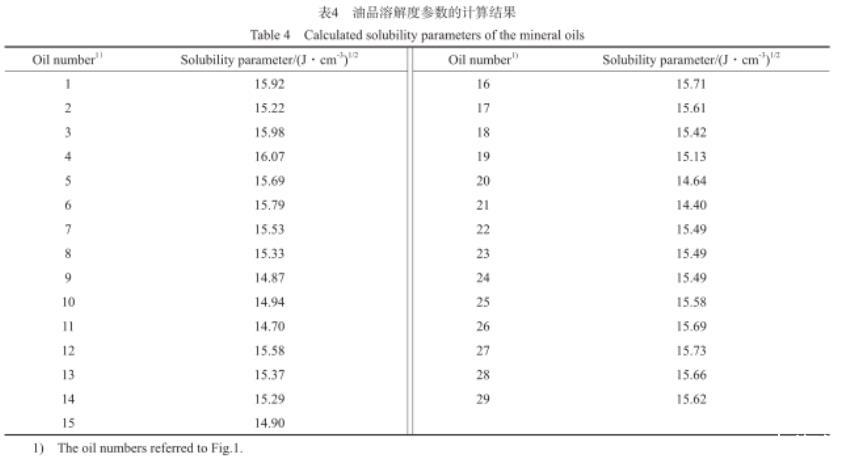 表面張力估算法測(cè)定29種常見(jiàn)低芳淺色礦物油的溶解度參數(shù)——結(jié)果與討論、結(jié)論
