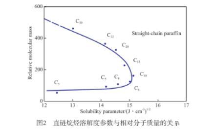 圖2直鏈烷烴溶解度參數(shù)與相對(duì)分子質(zhì)量的關(guān)系