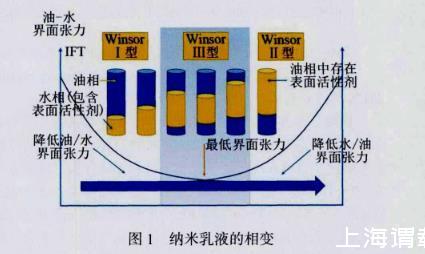 一般來說,納米乳液分為3種類型,即油包水型納米乳液(簡(jiǎn)稱W/O)、水包油型納米乳液(簡(jiǎn)稱O/W)和雙連續(xù)型納米乳液。Winsor根據(jù)油相或水相是否連續(xù)對(duì)納米乳液進(jìn)行分類,如圖1所示,即WinsorⅠ型是油包水型納米乳液,表面活性劑存在于水相中;WinsorⅡ型是水包油型納米乳液,表面活性劑存在于油相中;WinsorⅢ型是通過表面活性劑吸附界面膜作用形成的雙連續(xù)相體系,油相水相相對(duì)平衡,同時(shí)WinsorⅢ型納米乳液在高濃度表面活性劑作用下不能完全溶解油水,因此產(chǎn)生了WinsorⅣ型單相納米乳液,該體系中油相和水相總量大致相同;其中WinsorⅣ型和WinsorⅢ型均是超低界面張力的納米乳液。
