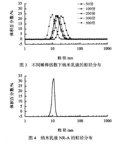 利用英國馬爾文2000激光粒度儀采用濕法進(jìn)行微乳液粒徑測(cè)量。圖3為微乳液在不同稀釋倍數(shù)下得到納米乳液的粒徑分布。從圖3可知,微乳液稀釋50倍時(shí)得到的納米乳液粒徑D50為10~50 nm;微乳液稀釋500倍時(shí)納米乳液粒徑D50為5~20 nm;微乳液粒徑隨稀釋倍數(shù)的增加而減小,符合乳液的粒徑分布規(guī)律。納米乳液NR-A由微乳液稀釋500倍后制得,其粒徑分布結(jié)果見圖4,從圖4可知,納米乳液NR-A的粒徑分布較窄,90%膠團(tuán)粒徑在11 nm以下。
