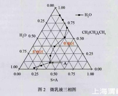 室內(nèi)研究中選用表面活性劑和助表面活性劑組合(S+A)為Tween 80、十八烷基二甲基溴化銨和正丁醇,油相為正辛烷,乳化溫度設(shè)為75℃時(shí),制備WinsorⅣ型單相納米乳液;其中,S+A與油相正辛烷按9∶1、8∶2、7∶3、6∶4、5∶5、4∶6、3∶7、2∶8和1∶9依次混合,然后逐滴加入蒸餾水,觀察加入蒸餾水后乳液的澄清渾濁現(xiàn)象來確定H2O/(S+A)/正辛烷體系單相微乳液的微觀結(jié)構(gòu)類型,得到的相圖如圖2所示。選取三相圖中A點(diǎn)的微乳液用蒸餾水定容稀釋并以60 Hz頻率超聲波震蕩5 min后,制得納米乳液NR-A。
