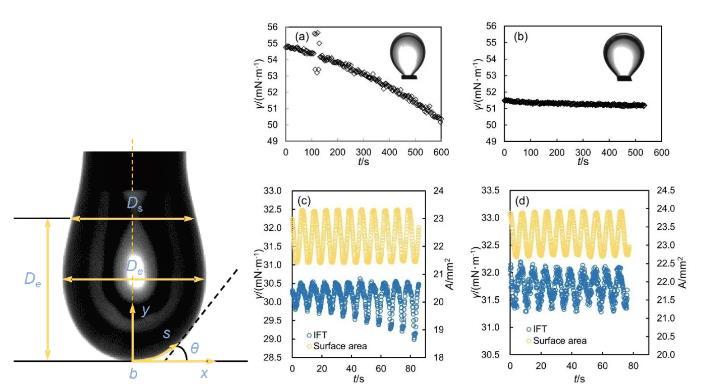 研究團(tuán)隊(duì)優(yōu)化了從樣品預(yù)處理、儀器改進(jìn)、實(shí)驗(yàn)測(cè)量到數(shù)據(jù)分析的全流程,提供了詳細(xì)的實(shí)驗(yàn)操作指南,涉及液滴控制、系統(tǒng)校準(zhǔn)和光學(xué)干擾處理等關(guān)鍵步驟。通過(guò)對(duì)氣水兩相和氣水油三相體系實(shí)際測(cè)量的有效數(shù)據(jù)和無(wú)效數(shù)據(jù)的展示和分析,驗(yàn)證了方法的有效性和準(zhǔn)確性。整套實(shí)驗(yàn)流程可基于不同實(shí)際條件在數(shù)天內(nèi)完成。圖2動(dòng)態(tài)懸滴表征(左圖);界面張力及界面流變性實(shí)驗(yàn)測(cè)量數(shù)據(jù)(右圖)本研究為界面性質(zhì)的測(cè)定樹(shù)立了新的標(biāo)準(zhǔn),通過(guò)優(yōu)化動(dòng)態(tài)懸滴表征方法,極大地提高了測(cè)量的可靠性和精度,體現(xiàn)了方法學(xué)創(chuàng)新;不僅對(duì)界面科學(xué)的基礎(chǔ)理論發(fā)展具有重要推動(dòng)作用,同時(shí)為材料科學(xué)、化學(xué)工程、環(huán)境科學(xué)等領(lǐng)域的實(shí)際應(yīng)用提供了技術(shù)支撐。