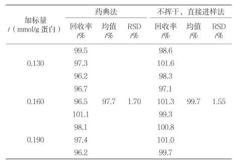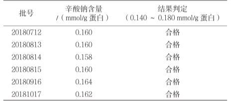 取每1 g蛋白質(zhì)中含0.130 mmol、0.160 mmol、0.190 mmol辛酸鈉的加標回收率溶液作為供試品,每個濃度分別制備3份進行測定,根據(jù)標準曲線計算辛酸鈉含量。