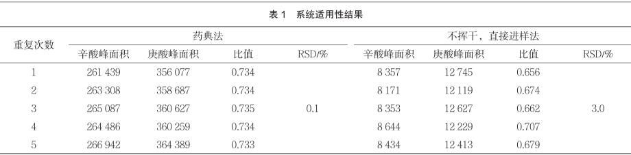 由表1可知,不揮干,直接進樣法(優(yōu)化后的方法)所得峰面積較小,這是因為優(yōu)化后方法的辛酸對照品溶液不揮發(fā)至干,直接進樣使得濃度變低,峰面積變小,但不影響積分。連續(xù)5針辛酸峰與庚酸峰面積之比的RSD值由藥典方法的0.1%變?yōu)?.0%,但仍符合系統(tǒng)適用性要求(不大于5%)。實驗時間由2 d縮短為1 d。