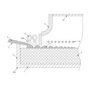 優(yōu)選的,所述窯外噴射方式為玻璃配合料4經(jīng)往復(fù)式投料機(jī)3加入窯爐100的投料池后,料堆6漂浮在熔融的玻璃液5上方,在料堆6被推入窯爐100內(nèi)前,將消泡劑200均勻噴撒在漂浮的料堆6表面。