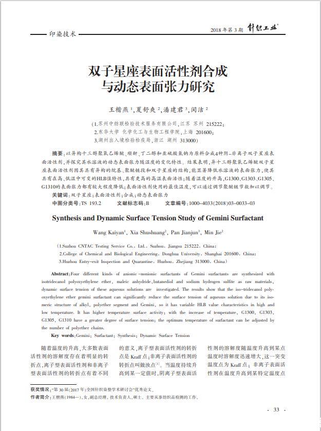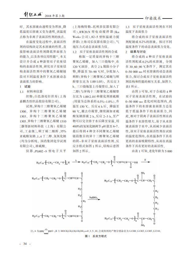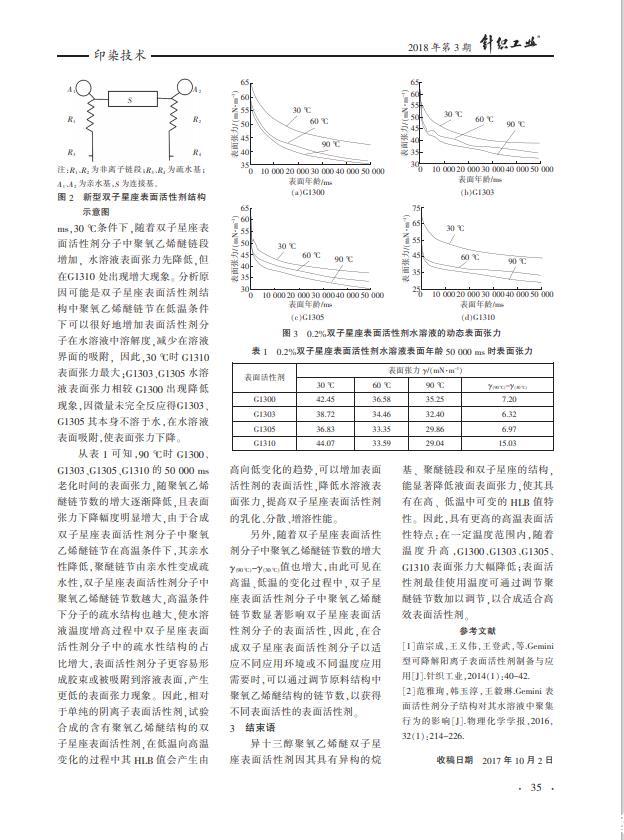 以異構(gòu)十三醇聚氧乙烯醚、順酐、丁二醇和亞硫酸氫鈉為原料合成4種陰-非離子雙子星座表面活性劑,并探究其水溶液的動態(tài)表面張力隨溫度的變化特性。結(jié)果表明,異十三醇聚氧乙烯醚雙子星座表面活性劑因其具有異構(gòu)的烷基、聚醚鏈段和雙子星座的結(jié)構(gòu),能顯著降低水溶液的表面張力,使其具有在高、低溫中可變的HLB值特性,具有更高的高溫表面活性;隨著溫度的升高,G1300、G1303、G1305、G1310的表面張力都有較大程度降低;表面活性劑使用的最佳溫度,可以通過調(diào)節(jié)聚醚鏈節(jié)數(shù)加以調(diào)節(jié)。