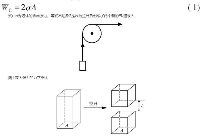 由此可見,表面張力與內壓力是兩個不同概念的力,前者作用于表面,力的作用方向與表面相切,其作用是使表面盡可能縮小;而后者則源于分子間作用力的合力,其作用方向垂直于表面且指向液體的體相。這兩種力密切相關,實為因果關系。有些專著用圖1所示的力學類比來形象地表示兩者間的關系猶如用滑輪舉起重物,舉重所做的功即為水平方向拉力所做的功,意即擴大液體表面積所增大的表面自由能等于液體從體相反抗內壓力移至表面需做之功。本文試圖更進一步在兩者之間建立定量關系。