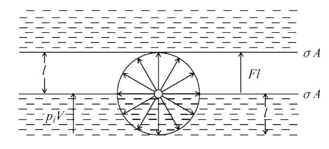 式中pi=(?U/?V)T是內壓力的熱力學定義,式(5)便是本文所得結果。由此可見,表面張力與內壓力的關系是很簡單的,它不僅說明了縱向作用的內壓力與表面上橫向作用的表面張力成正比,而且還能說明圖1所示的力學類比。圖3是該說明的示意圖。