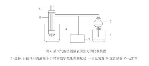 最大壓力氣泡法的原理是將毛細(xì)管端浸入液中,通過增加內(nèi)壓便產(chǎn)生氣泡,然后從管端成長的氣泡的最大泡壓可求出液體的表面張力。 最大壓力氣泡法使用的儀器主要為燒杯、抽氣用滴液漏斗、精密數(shù)字微壓差測量儀、恒溫裝置 、支管試管、毛細(xì)管等。檢測步驟當(dāng)然也先制樣,然后清洗儀器,之后檢驗(yàn)儀器,調(diào)節(jié)毛細(xì)管或液面高度,使毛細(xì)管口與水面相切。打開活塞抽氣,調(diào)節(jié)抽氣速度,使氣泡由毛細(xì)管尖端成單泡出,且每個氣泡形成的時間約為 6s-10s。在形成氣泡的過程中,液面半徑經(jīng)歷:大→小→大,同時壓力差計指示值的絕對值經(jīng)歷:小→大→小的過程,記錄下絕對值最大的壓力差三次,取其平均值。最大壓力氣泡法每次測量前應(yīng)注意:一定要用待測溶液清洗支管試管和毛細(xì)管,并振蕩洗滌。