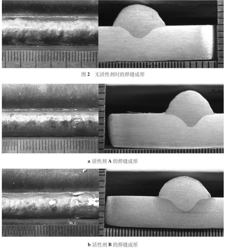 圖2是無活性劑時焊縫的宏觀成形,圖3為試驗中幾組典型活性劑的金相截面。