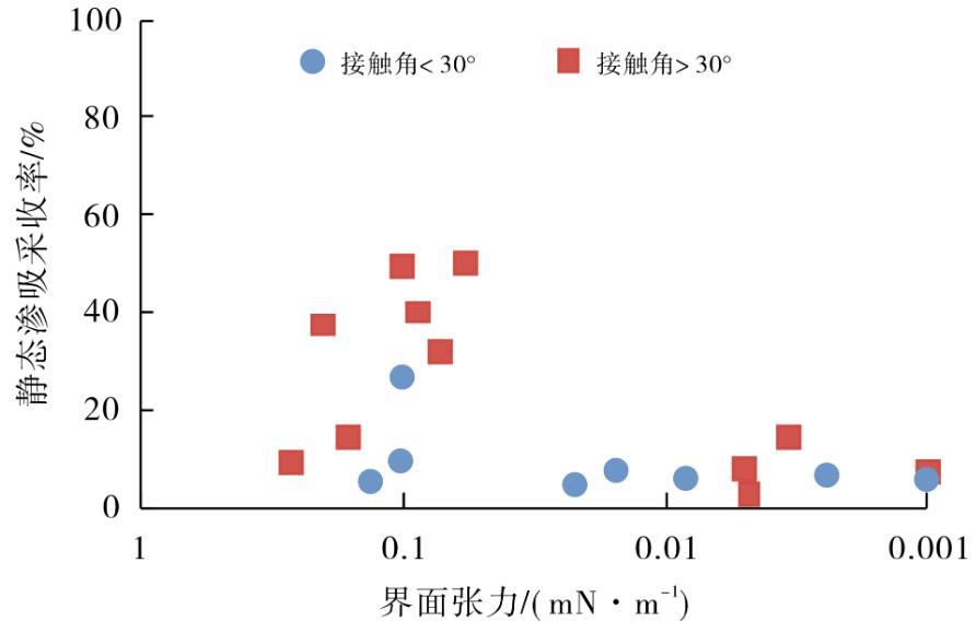 從圖1可知,界面張力大于0.01 mN·m-1時,高接觸角時反而滲吸采收率整體更高。當接觸角小于30°時,靜態滲吸采收率最高為26.67%,平均為10.66%;當接觸角大于30°時,靜態滲吸采收率最高為50%,平均為33.15%。從圖2、表1可知,當接觸角大于30°時,滲吸液的界面張力平均為0.096 mN·m-1;當接觸角小于30°時,界面張力則減小到0.043 mN·m-1,這是由于低的接觸角需要更高的表面活性劑濃度(接觸角小于30°時,表面活性劑濃度平均為0.259%;接觸角大于30°時,表面活性劑濃度平均為0.190%),從而導致界面張力降低。因此,化學滲吸時若使用表面活性劑類潤濕劑,應使用合適的濃度,避免為了追求低接觸角導致界面張力過小。