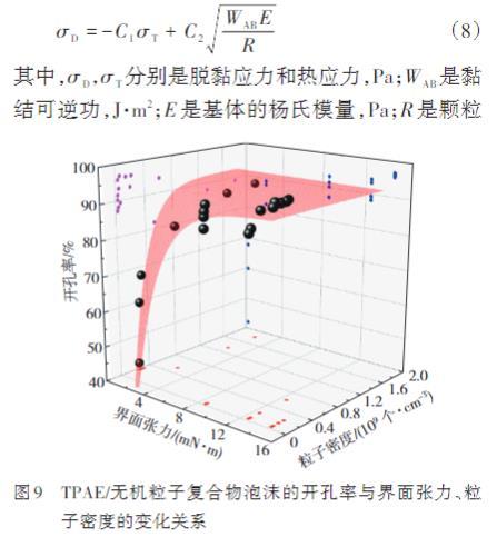 式(8)揭示了起始脫黏應(yīng)力受到粒子與基體間黏接強度(即界面張力)、楊氏模量以及顆粒尺寸的共同影響。隨著顆粒尺寸和界面張力的增加,脫黏所需的起始應(yīng)力降低,導(dǎo)致由顆粒脫黏引發(fā)的空隙會隨著更高的泡孔壁的拉伸變形速率而增加。對于TPAE/CaCO3、TPAE/CaSiO3及TPAE/WI這3種復(fù)合物,由于其較高的界面張力或較大的粒子直徑,促使分散相從TPAE基體中的脫落更為容易,較高的粒子密度導(dǎo)致異相成核位點增多,進而顯著提升泡孔密度和減少泡孔壁厚,泡沫生長過程中拉伸應(yīng)變速率的提高使泡孔壁所承受的拉伸應(yīng)力增大,從而導(dǎo)致復(fù)合物泡沫的開孔率進一步增加。其中,TPAE/WI復(fù)合物因在界面張力以及粒子分布密度上的雙重優(yōu)勢而具有最高的開孔率。