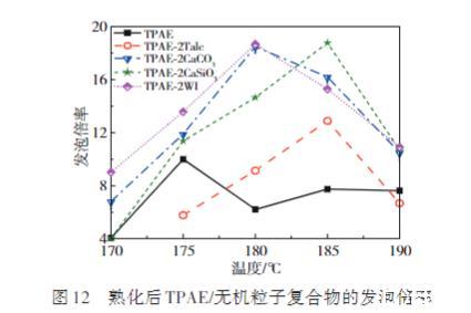 圖12展示了4種TPAE/無機粒子泡沫熟化后的發(fā)泡倍率隨溫度變化的情況。結(jié)果表明,相較于純TPAE,4種復(fù)合物泡沫的最終發(fā)泡倍率均有所增加,其中TPAE/CaCO3、TPAE/CaSiO3及TPAE/WI顯著提升。已知影響發(fā)泡倍率的主要因素有發(fā)泡劑的溶解度和聚合物的流變性能。由于無機粒子的添加量較少,基本不會影響CO2在復(fù)合物中的溶解度及流變性能。因此TPAE/無機粒子復(fù)合物的初始發(fā)泡倍率與純TPAE基本一致,但無機粒子的添加會促進TPAE形成開孔結(jié)構(gòu),尤其是CaCO3、CaSiO3以及WI可使TPAE形成高開孔率的泡沫,減小了泡沫的收縮,使得完全熟化后的發(fā)泡倍率遠(yuǎn)高于TPAE,大大提高了TPAE的發(fā)泡性能。