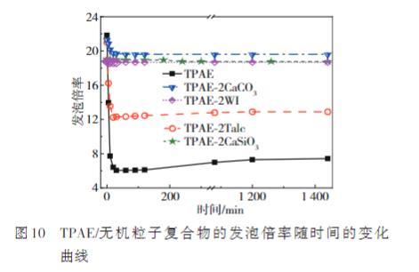 圖10 TPAE/無機粒子復(fù)合物的發(fā)泡倍率隨時間的變化曲線