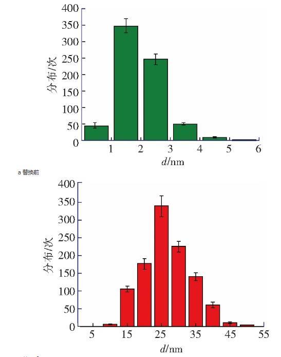納米氣泡的高度在8~20 nm范圍之內(nèi),直徑在100~500 nm范圍之內(nèi),圖3c為圖3b中典型納米氣泡的截面圖。掃描得到納米氣泡圖像以后,在該表面上進(jìn)行力曲線測量實(shí)驗(yàn),如圖2b所示。所有離曲線的‘跳進(jìn)’距離均大于10 nm且是變化的,同時,由雙電層引起的斥力也消失了,不符合DLVO理論。這種‘跳進(jìn)’距離不同的長程力應(yīng)該是因?yàn)榇?水替換后HOPG表面上生成的納米氣泡造成的。圖3b中納米氣泡的覆蓋率約為21.8%,在該表面不同位置測量得到的力曲線必然會存在探針-HOPG相互作用的情況,即不都是探針-氣泡的相互作用的情況。然而,根據(jù)醇-水替換前后多次測量力曲線得到“跳進(jìn)”距離d的統(tǒng)計分析(圖4a和圖4b),醇-水替換前測量得到的力曲線的“跳進(jìn)”距離大部分都小于5 nm(99%),而醇-水替換后測得的力曲線的“跳進(jìn)”距離均大于10 nm。這表明,醇-水替換后即使不是探針-氣泡相互作用的情況下,探針與HOPG表面的相互作用時仍然存在長程引力,而這應(yīng)該是IGE造成的。該研究結(jié)果與Peng等人的研究結(jié)果一致,驗(yàn)證了Limbeek對IGE與納米氣泡共存的假設(shè)。