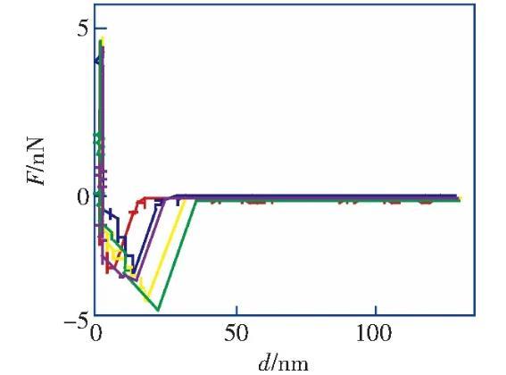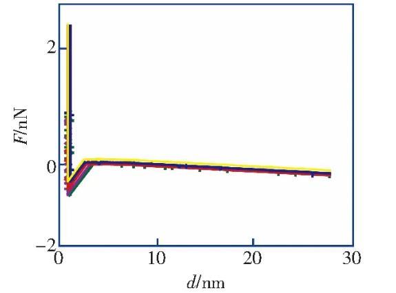 筆者利用原子力顯微鏡實(shí)驗(yàn)測量了HOPG表面在醇-水替換前后的力距離曲線,發(fā)現(xiàn)醇-水替換前進(jìn)針曲線的跳進(jìn)距離小于5 nm,滿足DLVO理論;而在醇-水替換后納米氣泡覆蓋率為21.8%的情況下,進(jìn)針曲線的跳進(jìn)距離均大于10 nm,不能再用DLVO理論解釋,證明了IGE與納米氣泡共存這一現(xiàn)象。根據(jù)改進(jìn)的Laplace-Young方程,結(jié)合文獻(xiàn)中對納米氣泡線張力值的計算結(jié)果,分析負(fù)的線張力對過渡區(qū)內(nèi)局部表面張力及局部固-液界面的影響,導(dǎo)致納米氣泡的接觸角反常小的原因之一。分析并討論雜質(zhì)對納米氣泡接觸角的影響,指出IGE與納米氣泡共存、線張力及雜質(zhì)影響的共同作用是導(dǎo)致納米氣泡接觸角“反常小”的原因。