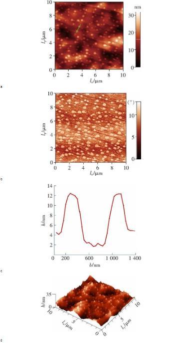 圖2a是探針在超純水中HOPG表面測得的力-位移曲線,當(dāng)分離距離大于5 nm時,針尖和表面之間的作用力主要為斥力。由于實(shí)驗(yàn)中的水呈弱酸性(PH約5.6),而研究表明,HOPG表面在弱酸性水中帶弱負(fù)電荷,探針針尖(單晶硅)在水中也認(rèn)為是帶弱負(fù)電荷。因此,這個斥力可以解釋為雙電層(Electrostatic double layer,EDL)引起的。當(dāng)分離距離小于5 nm時,在范德華力的作用下,針尖產(chǎn)生‘跳進(jìn)’(jump in)現(xiàn)象并與HOPG表面接觸,整個力曲線符合DLVO理論。醇-水替換之后,在10 10掃描區(qū)域內(nèi)采用Taping-Mode模式(95%的set-point)以1 Hz的掃描頻率,如圖3a所示,HOPG表面上生成的納米氣泡呈球冠狀,相應(yīng)的三維圖如圖3d所示。